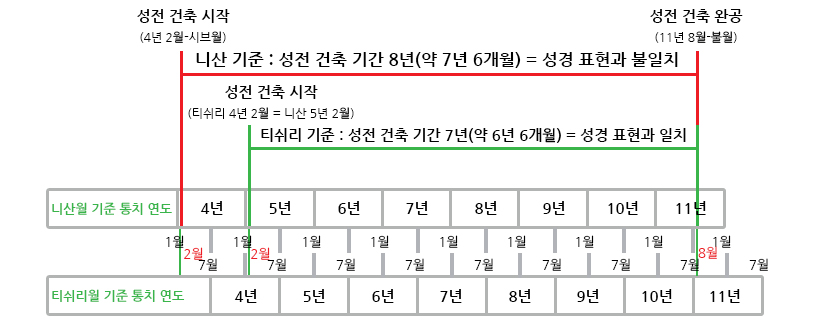 성전 건축을 마친 솔로몬 제 11년 불월(종교력 8월)은 티쉬리월이나 니산월, 어떤 것을 기준으로 하든 똑같은 시점입니다. 그러나 성전 건축을 시작한 솔로몬 제 4년 시브월(종교력 2월)은 티쉬리월과 니산월 기준에서 1년의 차이가 발생합니다.