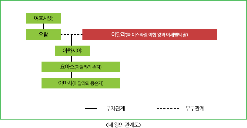 남 유다 6대 왕 여호사밧은 여호와 보시기에 정직히 행하며(왕상 22:43, 대하 20:32), 전심으로 하나님의 말씀대로 행한(대하 17:6) 선한 왕이었으나 자신의 가문뿐만 아니라 남 유다에 아주 치명적인 실수를 저지릅니다. 그것은 아들 여호람을 아달랴(북 이스라엘 아합 왕의 딸)와 결혼시킨 것입니다. 이로 인해 향후 오랜 기간 동안 남 유다는 극심한 영적 폐해에 시달리게 됩니다.