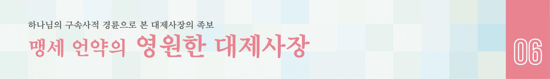 「하나님의 구속사적 경륜으로 본 대제사장의 족보 맹세 언약의 영원한 대제사장」라는 제명에서 “맹세 언약의 영원한 대제사장”이란 말은 우리의 대제사장이신 예수 그리스도를 일컫는 칭호로 히브리서 7:28에 나오는 말입니다. 우리 인간들은 죄인들이라 거룩하신 하나님 앞에 직접 나갈 수 없습니다. 그래서 하나님께서는 우리 죄인들이 제물을 가지고 제단에 나아가, 제사장을 통하여 하나님께 제사를 드림으로 우리의 죄를 용서받고 하나님과 교제하며 살도록 제사 제도를 만드셨습니다. 구속사 가운데 제사장은 장차 오실 영원한 대제사장 예수 그리스도에 대한 모형입니다. 모형이란 아파트의 모델 하우스와 같은 것이어서 청약자는 그 아파트 실형의 공사가 완성되기를 바라고, 기다리며 살다가 완성되었을 때, 그곳에 입주하여 살게 되는 것과 같습니다. 따라서 모형과 실형은 서로 뗄래야 뗄 수 없는 관계입니다. 모형이 있으면 실형이 있고, 실형이 있으면 모형이 있기 마련입니다. 따라서 대제사장이신 예수님을 알려면 구약의 제사장들을 알아야 합니다. 예수님의 족보가 중요하다면 제사장들의 족보도 중요합니다. 그래서 성경에는 다양한 면에서 하나님의 구속 사업에 관련된 사람들의 족보가 수록되어 있고, 그 중에서도 제사장들의 족보는 거의 완벽하게 기술해 놓았습니다.