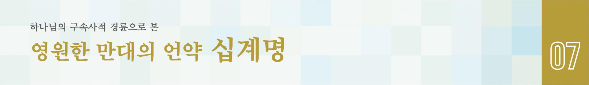 구속사 시리즈 7권의 주제인 "십계명"은 출애굽한 이스라엘을 언약 백성 삼으시기 위해 하나님께서 시내산 언약을 맺으시는 가운데 주신 것이다. 해발 2,291미터 높이의 험한 바위산인 시내산 , 모세는 시내산 정상을 자그만치 여덟 차례나 반복하면서 하나님과 이스라엘 백성이 언약을 체결하는 중대한 일에 꼭 필요한 중보 사역을 충실하고도 헌신적으로 담당했다. 구속사 시리즈 7권은 이러한 모세의 시내산 8차 등정 일정을 세계 최초로 정리하여 수록하였다. 또한 '모세가 시내산에 한 번씩 올라갈 때마다 어떤 사건들이 일어났는지 그 순서와 내용을 정확하게 이해하면, 시내산 언약의 체결 배경과 과정, 그리고 언약 속에 깃들인 하나님의 구속 섭리를 무수히 깨닫게 된다.'고 말하고 있다.