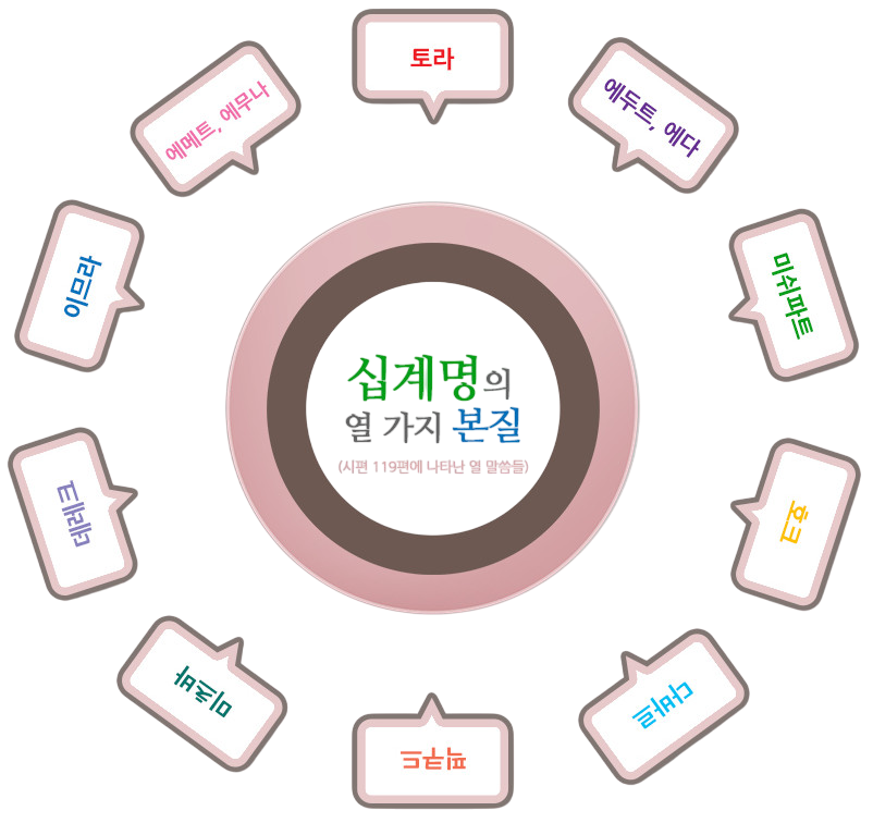 신구약 성경을 핵심적으로 요약한 열 가지 말씀이 십계명인데, 시편 119편에서 하나님의 ‘말씀’에 해당하는 히브리어 단어 열 가지를 통해, 십계명의 본질을 완벽하게 노래하고 있다. 즉 하나님의 율법은 인간을 속박하고 옭아매는 규정이 아니라, 하나님 백성의 삶 속에 깊이 뿌리내린 신앙의 기초 곧 믿음, 사랑, 의지함, 전적인 순종, 이 모든 것을 가능케 하는 힘과 생명임을 잘 나타내고 있다.