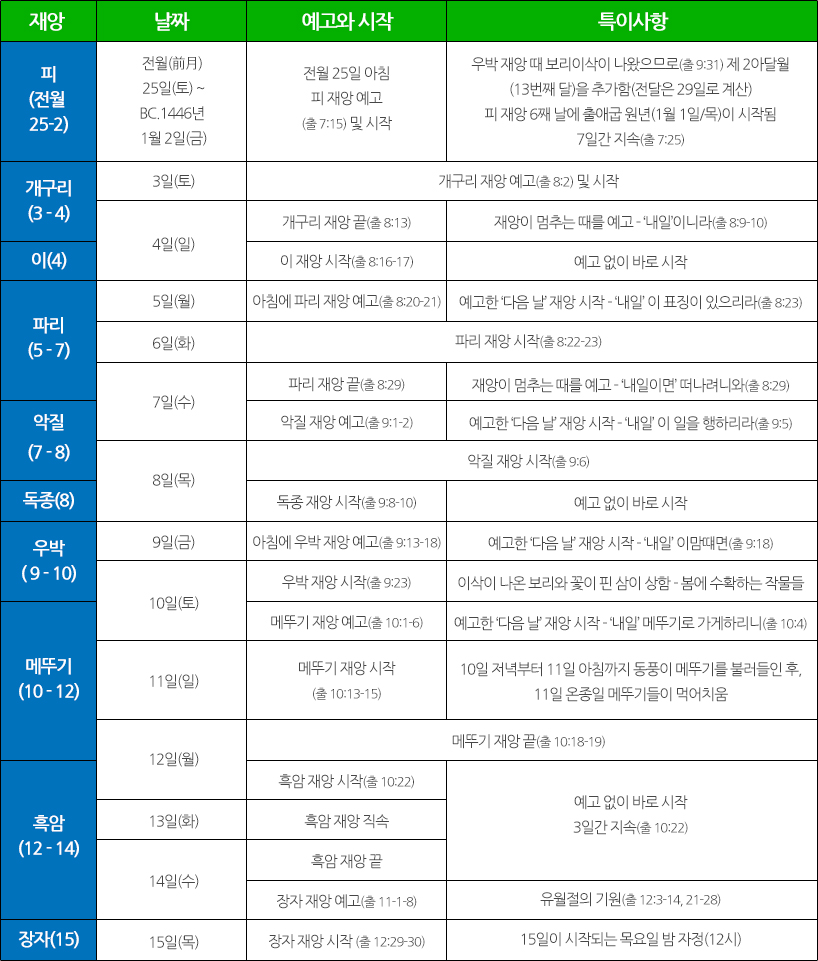 이러한 몇 가지 주요 사항과 성경의 기록을 중심으로 10대 재앙의 시기를 살펴볼 때, 10대 재앙이 새로운 달의 바로 전(前)달 25일(토)부터 주전 1446년 1월 15일(목)까지 20일 동안 잇달아 일어난 연속적인 사건임을 알 수 있습니다.