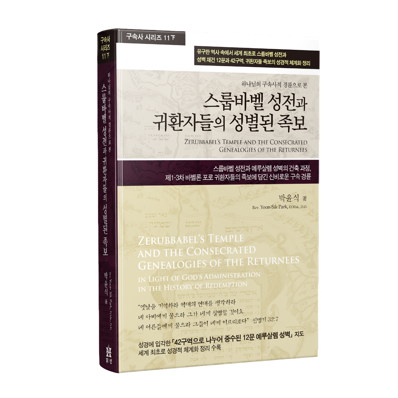 구속사 시리즈 제11권下 「스룹바벨 성전과 귀환자의 족보」(도서출판 휘선, 박윤식 저)가 2021년 12월 17일 출간됐다. 당초 이날 출판감사예배가 드려 질 예정이었으나 코로나 19 방역지침으로 25일(토)로 미뤄졌고, 예배 직후 온·오프라인 대형서점에서 시판이 시작된다. 2019년 12월 17일 발간된 구속 사 시리즈 제11권上 「여호와 삼마 에스겔 성전」이 유구한 역사 속에 세계 최초로, 에스겔에게 보여주신 새 성전의 구체적인 모습을 성경을 근거로 분 명하게 밝혔다면, 이번 제11권下는 새 성전의 모습이 부분적으로 실현된 스 룹바벨 성전과 예루살렘 성벽 완공까지의 역사를 두 눈으로 지켜보듯 생생하게 해설하고, 에스겔 성전 과 일맥상통하는 영적 교훈을 선포한다. 핵심 주제 세 가지를 미리 살펴본다.