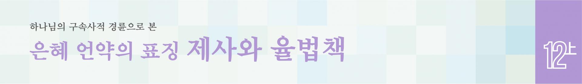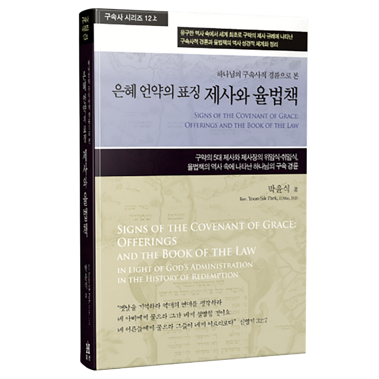 구속사 시리즈 제12권(上) <은혜 언약의 표징 제사와 율법책>이 출간됐다. 휘선 박윤식 목사가 12년 전에 십계명과 성막, 언약궤, 에스겔 성전, 스룹바벨 성전 등의 주제와 함께 정리하여 준비한 원 고가 마침내 세상에 모습을 드러낸 것이다. ‘평강제일교회 60주년 기념 예배’와 때맞춰 출간됨으로 써 지난 12년이란 시간이 연기된 게 아니라 하나님의 정확한 시간표대로 때를 따라 진행된 일이었 음을 확인시켜 준다. 제12권(上) <은혜 언약의 표징 제사와 율법책>은 역시 성경 말씀과 구속사에 담겨 있는 비밀과 은혜를 풍성하게 쏟아냄으로써 앞선 시리즈물처럼 독자들의 기대를 저버리지 않 았다.