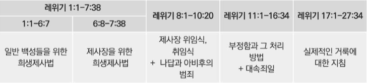 레위기의 전반부는 5대 제사의 규례와 제사장의 위임식·취임식에 대해서 말씀하고 있고, 후반부에는 언약 백성이 정결과 거룩을 지키기 위한 실질적인 지침들을 말씀하고 있다.