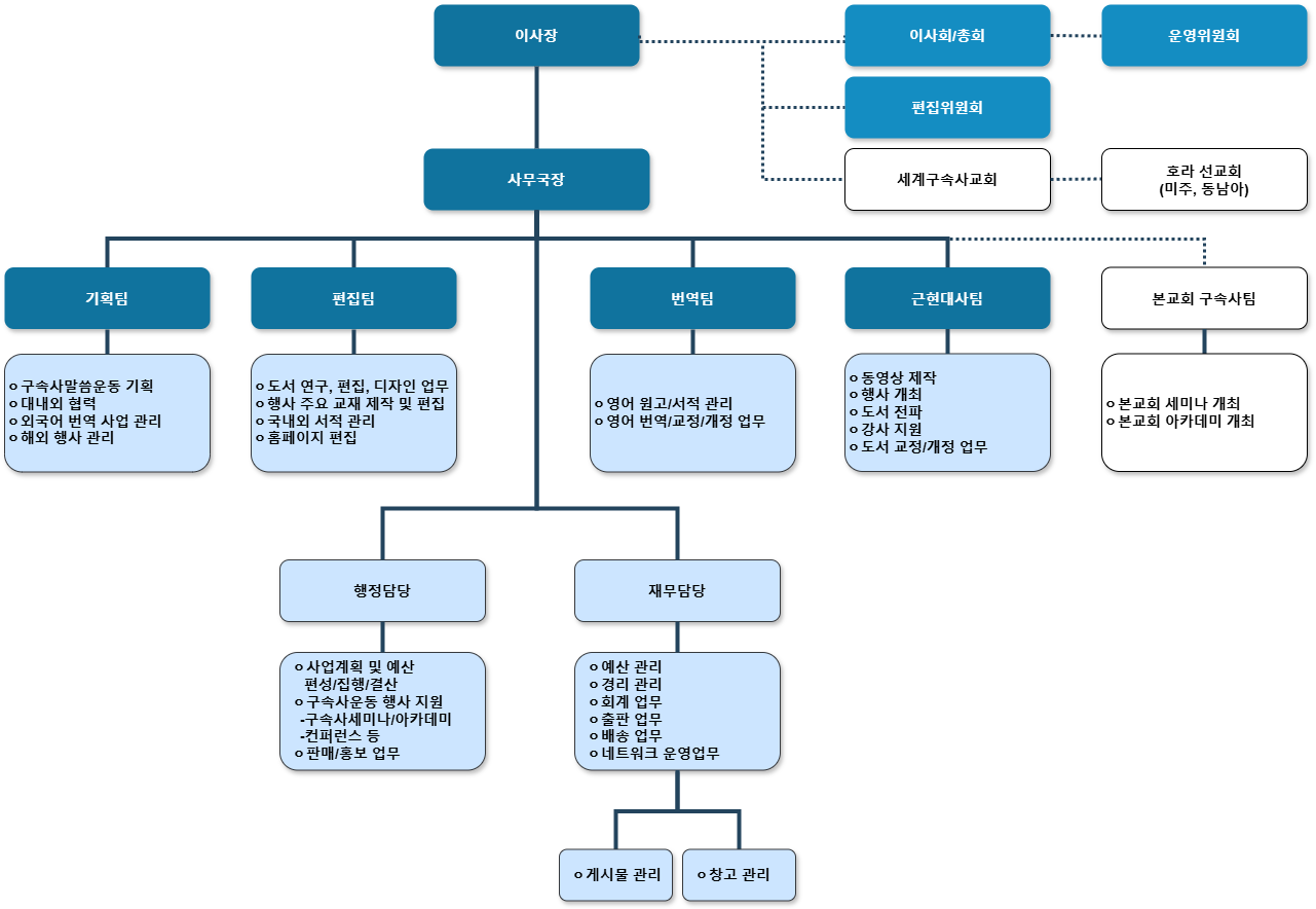 구속사운동을 위한 사업에 구속사운동센터 사무국에 기획팀, 편집팀, 번역팀, 근현대사팀 및 행정, 재무, 네트워크 등 행정업무를 수행하는 담당자들이 활동 하고 있고, 모든 교회와 단체가 연합하여 세계복음화를 위한 선교를 위하여 세계구속사교회와 그리고 교회 세미나, 아카데미를 전담하는 교회 구속사팀과 함께 활동하고 있다.